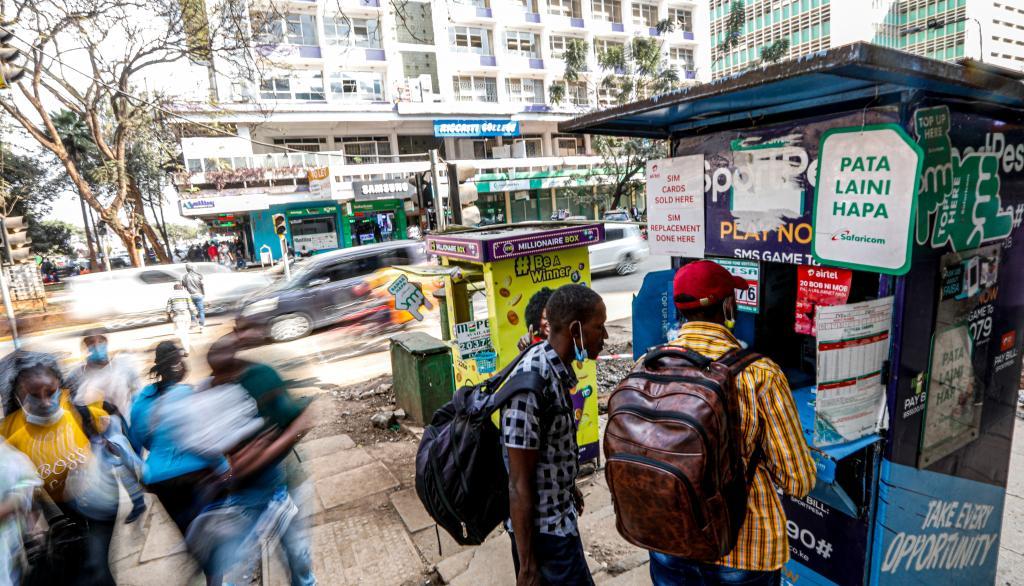 2021年9月16日,人們在肯尼亞首都內(nèi)羅畢市中心一處M-Pesa代理網(wǎng)點辦理業(yè)務(wù)。新華社記者張宇攝