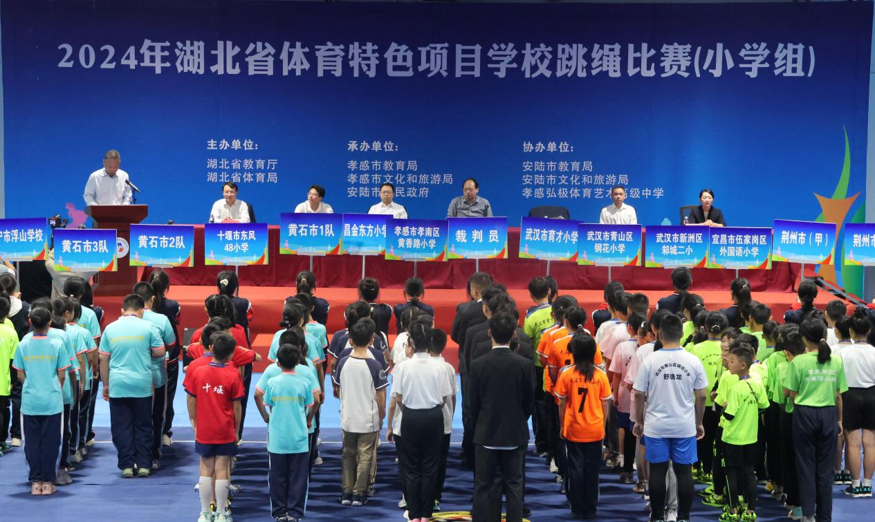 丁雪峰宣布2024年湖北省體育特色項(xiàng)目學(xué)校跳繩比賽(小學(xué)組)正式開賽。