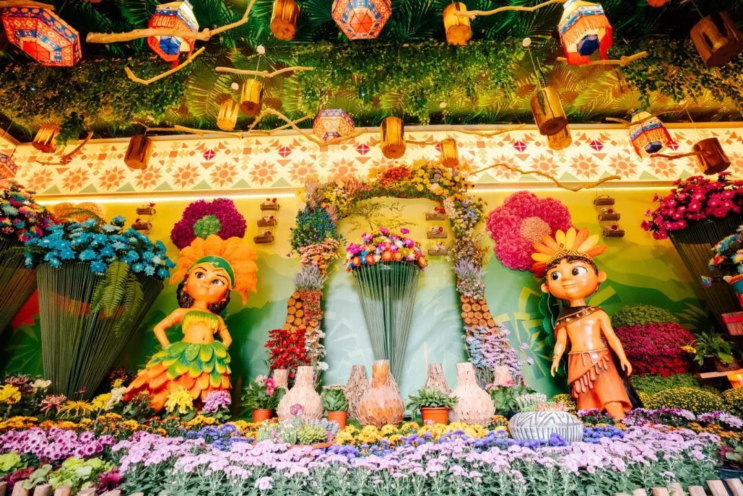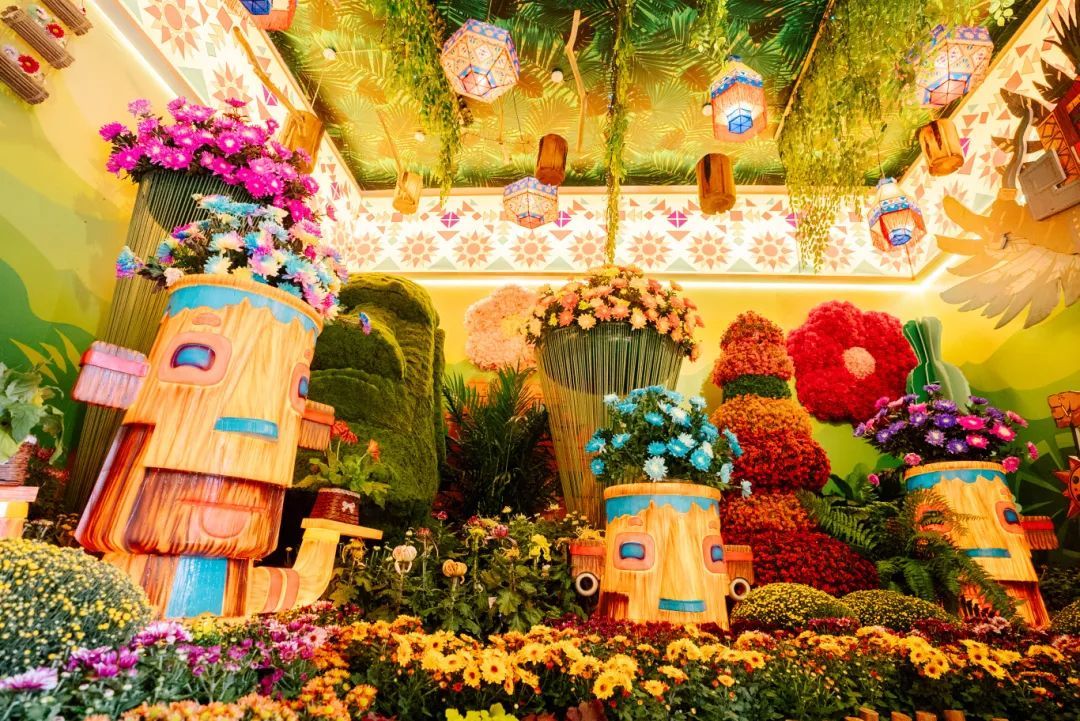 美洲館中異國(guó)菊花品種與南美洲文化的巨人石像、熱帶蜂鳥、巴西嘉年華IP、波利尼西亞人等元素相融合,展示了南美洲文化的獨(dú)特魅力,并通過菊花花展的形式向游客展示南美洲的藝術(shù)、美學(xué)和生活方式。