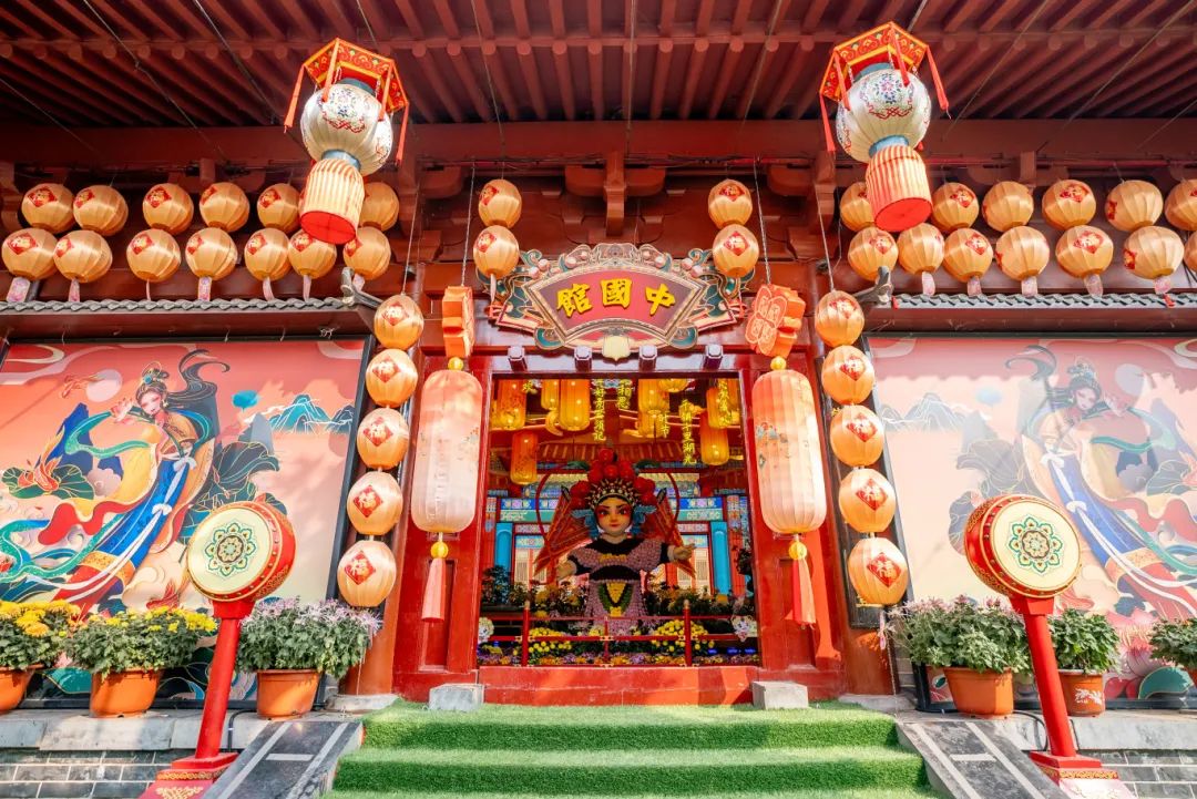 中國(guó)館以中國(guó)傳統(tǒng)曲藝為設(shè)計(jì)理念,以中國(guó)傳統(tǒng)戲臺(tái)為背景,擺放大量的精品菊花帶,中間身穿戲服的穆桂英與兩側(cè)演奏古典樂器的女子都采用乒乓菊扦插技術(shù)。曲藝與自然式花帶相結(jié)合,展現(xiàn)出一種神秘而美妙的意境,吸引游客沉浸其中,感受古代藝術(shù)與自然之美的交融。