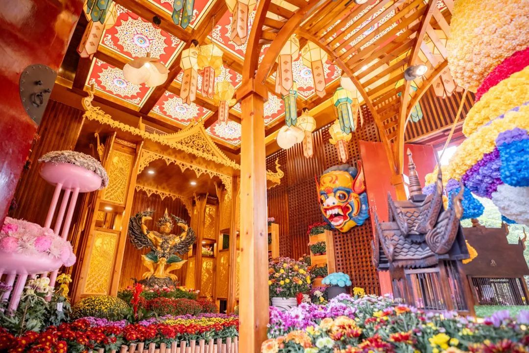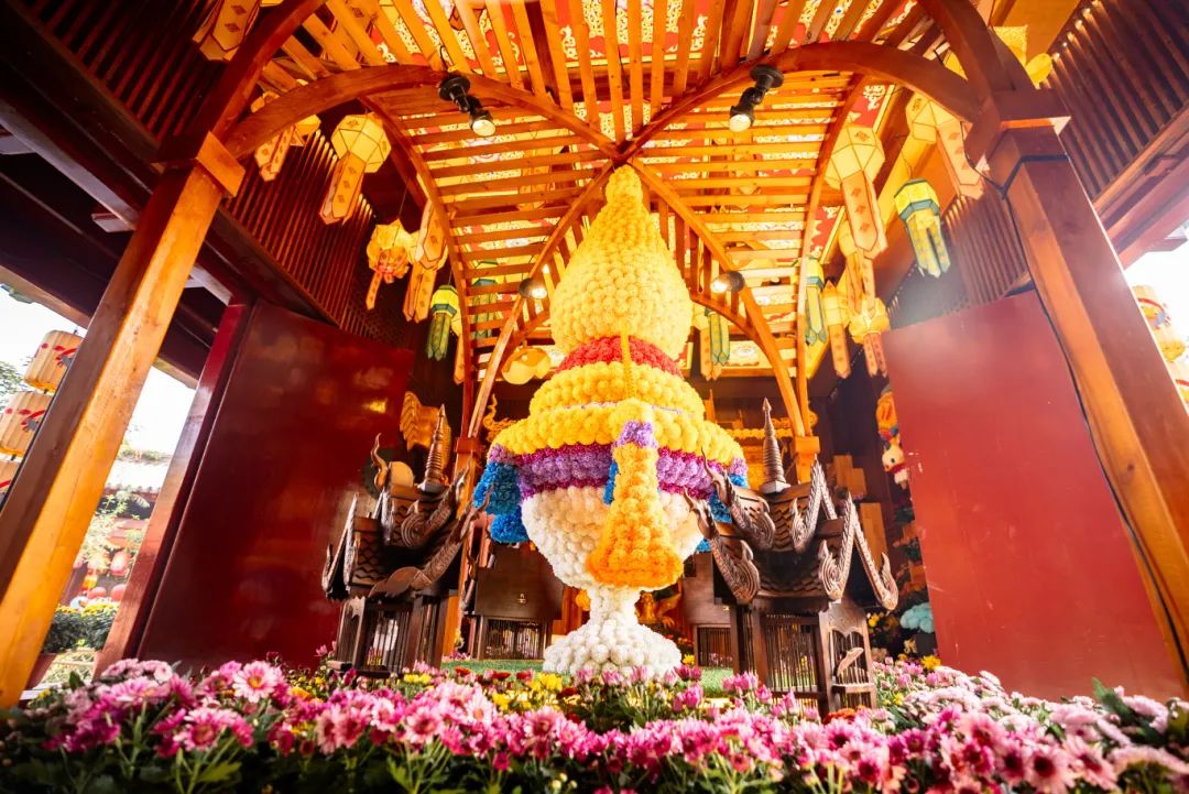 東南亞館將泰國(guó)文化與菊花巧妙結(jié)合,打造出一場(chǎng)異國(guó)風(fēng)情的菊花景點(diǎn),為游客帶來了解泰國(guó)文化和欣賞菊花美景的雙重體驗(yàn),主體部分用切花小菊扦插而成,布置各種色彩斑斕的菊花,結(jié)合泰國(guó)傳統(tǒng)花卉布置風(fēng)格,搭配泰國(guó)絲綢花布等裝飾,營(yíng)造出濃郁的泰國(guó)風(fēng)味。