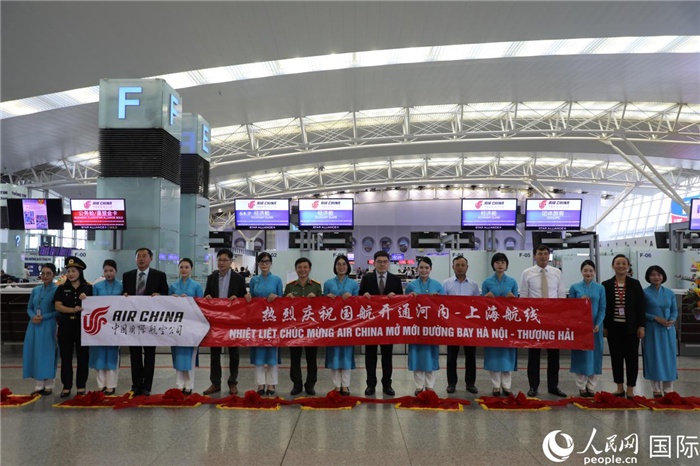 國航上?!觾?nèi)首班飛機(jī)抵達(dá)河內(nèi)內(nèi)排機(jī)場(chǎng)。人民網(wǎng)記者 楊曄攝