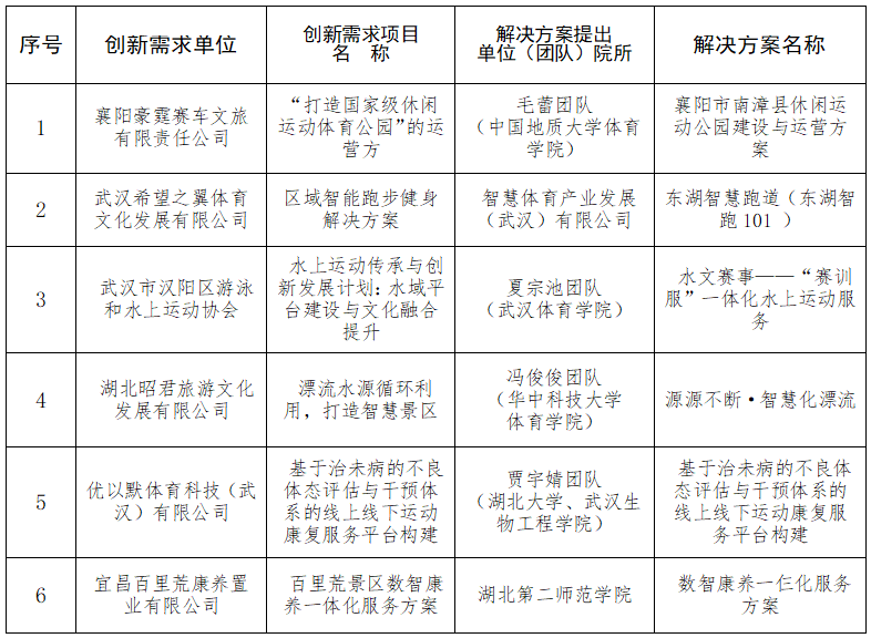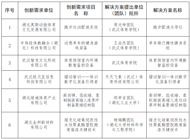 2024年6月12日,省體育局發(fā)布了《關(guān)于開展2024年湖北省體育產(chǎn)業(yè)創(chuàng)新創(chuàng)業(yè)大賽的公告》,在全省范圍內(nèi)征集體育產(chǎn)業(yè)創(chuàng)新需求和解決方案。10月29日,省體育局組織專家對(duì)參賽項(xiàng)目進(jìn)行了初賽評(píng)審,最終,推薦體育服務(wù)類、體育制造類各前六名進(jìn)入決賽路演?,F(xiàn)將進(jìn)入決賽路演的項(xiàng)目名單進(jìn)行公示,公示期3天,公示時(shí)間為10月30日至11月1日。