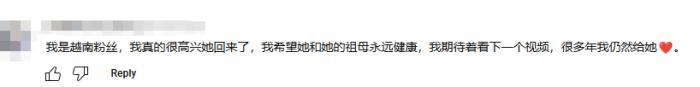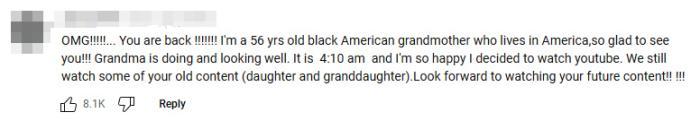 一位美國網(wǎng)友寫道:“天?。。?!你回來了?。。∥沂且幻钤诿绹?6歲黑人奶奶??吹侥?的視頻)真是太好了。(你的)奶奶看上去狀態(tài)也很好?,F(xiàn)在是凌晨4點(diǎn)10分,我對自己點(diǎn)開YouTube的決定無比開心。我們(女兒和外孫女)還在看你以前的視頻。期待看到你未來的作品?!?/p>