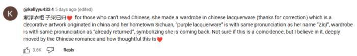 還有網(wǎng)友分析這期以“衣柜”為主題的視頻,贊嘆“中國式浪漫”:“她將一件舊衣柜翻新為漆器,這是一種源自中國和她的家鄉(xiāng)四川的裝飾藝術(shù)品。‘紫色漆器’與她的名字‘子柒’發(fā)音相同,‘衣柜’與‘已經(jīng)歸來’相同,象征著李子柒已經(jīng)歸來。不確定這是不是巧合,但我愿意相信,我被這中國式浪漫深深打動了?!?/p>
