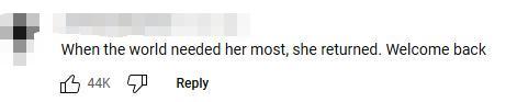 還有網(wǎng)友表示,“當(dāng)世界最需要她的時(shí)候,她回來了,歡迎回來?!?/p>