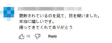 有日語留言:“看到更新時(shí)我簡直不敢相信自己的眼睛。真的很高興。謝謝你回來?!?/p>