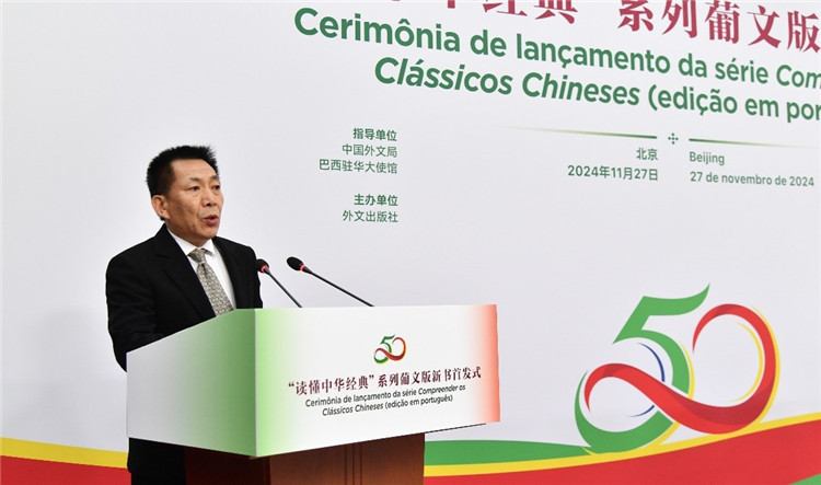 “讀懂中華經(jīng)典”系列葡文版新書首發(fā)式27日在京舉行,圖為外交部拉美司參贊張文偉在發(fā)表致辭。圖片由中國(guó)外文局提供