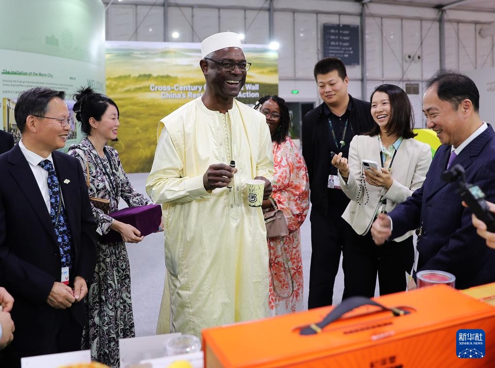在鄂爾多斯展區(qū),負(fù)責(zé)解說的中國國家林業(yè)和草原局官員向蒂奧介紹,風(fēng)電光伏治沙能有效利用資源、減少碳排放。蒂奧指著圖片中的光伏板問道:“沙漠里建光伏電站的困難之一在于沙塵會聚積在光伏板上,你們怎么清潔呢?”
