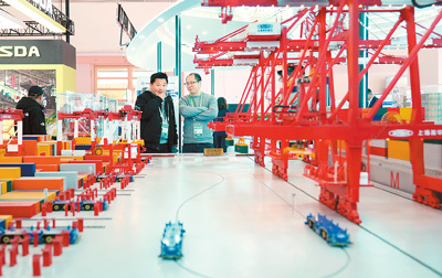 11月27日,在第二屆鏈博會(huì)先進(jìn)制造鏈展區(qū),人們?cè)谥薪患瘓F(tuán)展臺(tái)參觀上海洋山四期自動(dòng)化碼頭模型。