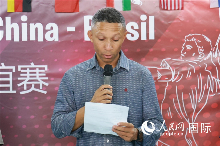巴西羽毛球文化協(xié)會(huì)主席亞歷山大·奧利維拉在決賽開幕式致辭。人民網(wǎng)記者 陳海琪攝