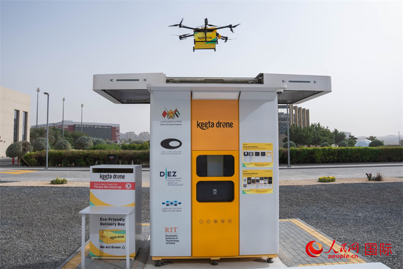 在當(dāng)天舉行的無人機(jī)配送演示活動上,只見工作人員打開手機(jī)外賣軟件,挑選好餐品后選擇無人機(jī)送貨地點,大約十分鐘的時間后,低沉穩(wěn)定的嗡嗡聲傳來,攜帶外賣盒的無人機(jī)緩緩降落到位于羅徹斯特理工學(xué)院迪拜分校的外賣柜。輸入驗證碼,取出外賣盒,熱騰騰的美食出現(xiàn)在面前。