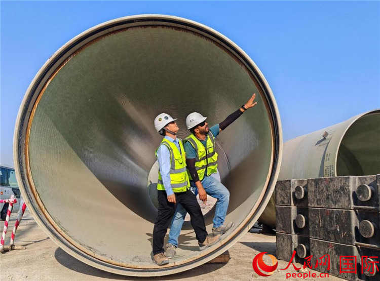 工作人員在察看輸水管情況。人民網(wǎng)記者 管克江攝