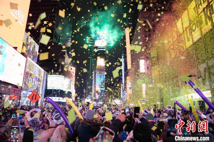 23時(shí)59分,持續(xù)了數(shù)小時(shí)的大雨已停,時(shí)報(bào)廣場大屏幕開始顯示倒數(shù)。在此起彼伏的歡呼聲中,由2688塊三角形水晶板組成的水晶球緩緩落下,絢麗的煙火隨之綻放,成千上萬寫有新年愿望的彩色紙片在空中飄灑。人們在音樂和歡呼聲中迎來新年。