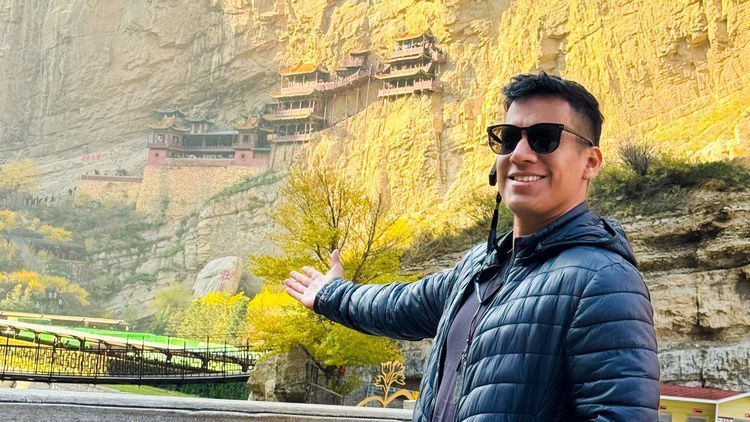 2024年10月,卡洛斯參加了學(xué)校組織的“感知中國——山西文化行”社會實踐與文化體驗活動,并與懸空寺合影(受訪者供圖)