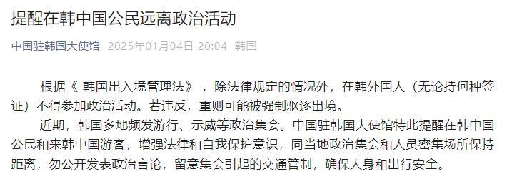 央視網(wǎng)消息:中國駐韓國大使館1月4日提醒:根據(jù)《韓國出入境管理法》,除法律規(guī)定的情況外,在韓外國人(無論持何種簽證)不得參加政治活動。若違反,重則可能被強制驅逐出境。