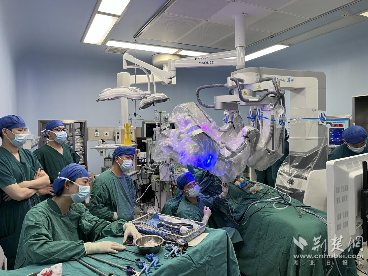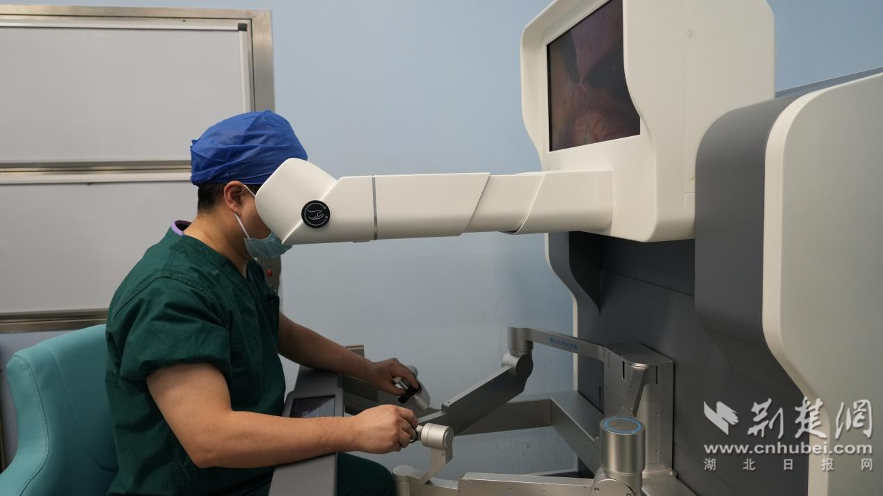 兩例手術均由孝感市中心醫(yī)院泌尿外科主任魏卓主刀,他在操控臺前通過觀看3D高清放大的視圖,眼看、手動、腳踩,發(fā)出一系列指令,精確地操縱著伸入患者體內(nèi)的四支蛇形機械臂,完成了一系列精細的操作,包括前進、后退、分離和電凝等動作。主治醫(yī)師范哲奇、住院醫(yī)師肖邦則在手術臺上根據(jù)手術需要適時更換器械。