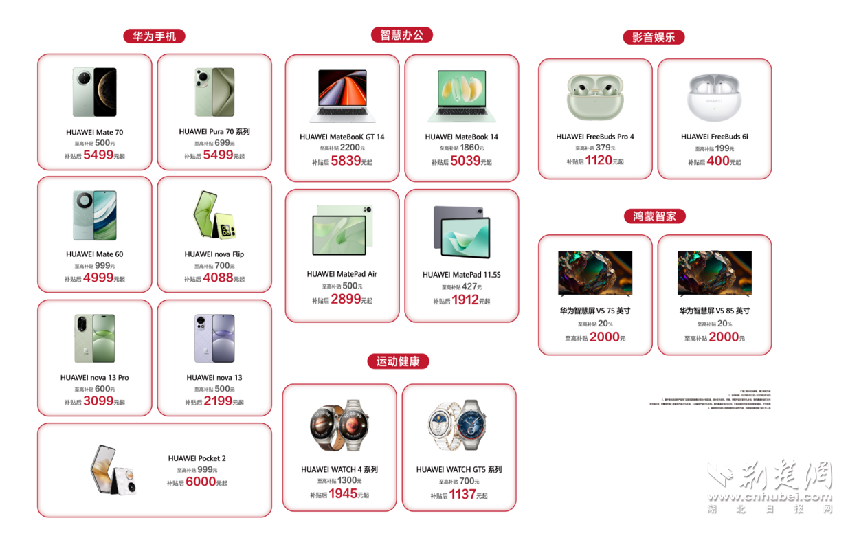 荊楚網(wǎng)(湖北日報網(wǎng))訊 (通訊員 高洋)2025年1月20日,“國補”政策首次擴圍至消費電子行業(yè)。對個人消費者購買華為手機、平板、智能手表手環(huán)等3類數(shù)碼產(chǎn)品(單件銷售價格不超過6000元),按產(chǎn)品銷售價格的15%給予補貼,每位消費者每類產(chǎn)品可補貼1件,每件補貼不超過500元。對于想要購買華為手機的消費者來說,這波優(yōu)惠力度拉滿。