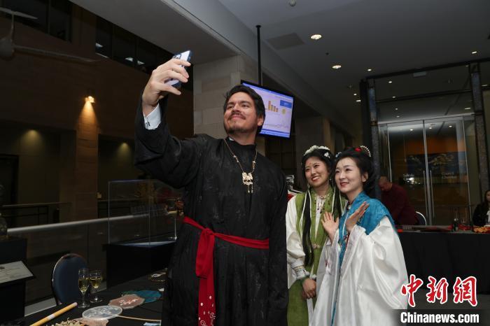 當?shù)貢r間1月22日晚,中國駐蒙特利爾總領館與中國駐國際民航組織理事會代表處在位于加拿大蒙特利爾的國際民航組織(ICAO)總部聯(lián)合舉辦2025年春節(jié)招待會。圖為與會來賓體驗試穿漢服,并與當?shù)厝A人漢服團體的青年人自拍。中新社記者 余瑞冬 攝