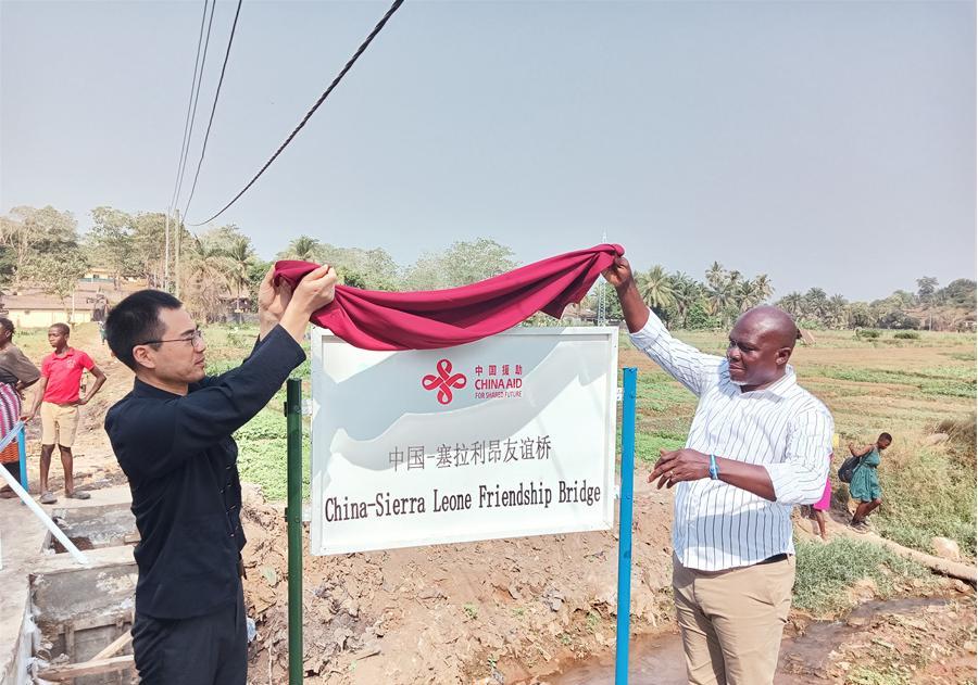 中國駐塞拉利昂大使王擎(左)和博城市市長穆薩(右)為中國—塞拉利昂友誼橋揭牌。中國援塞農(nóng)業(yè)專家組供圖