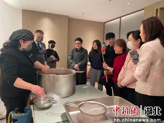 艷陽(yáng)天酒店的黃燜圓子制作技藝是武漢市非物質(zhì)文化遺產(chǎn)。當(dāng)天,在艷陽(yáng)天酒店大廚指導(dǎo)下,臺(tái)胞們學(xué)習(xí)制作炸圓子。他們戴上手套,將豬肉、魚茸等調(diào)制而成的餡料擠成丸子形狀,放入鍋中,待炸至金黃撈出,香氣四溢開來。