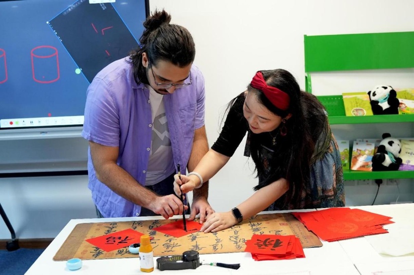 中沙小朋友合唱《我和我的祖國》,學(xué)習(xí)中文的阿布都熱哈曼、沙達(dá)德等與同學(xué)們合唱“新年你好”,小朋友緊張有序地通過三階魔方拼出了新年“燈籠”……活動上還有中阿文歌曲表演、包餃子以及寫福字、剪紙、趣味游戲等豐富多彩的體驗環(huán)節(jié),并特別設(shè)計了春節(jié)知識問答環(huán)節(jié),例如“放煙花的意義是什么?”“春節(jié)有哪些傳統(tǒng)服飾和習(xí)俗?”等問題,大家爭先恐后地?fù)尨穑械幕卮鹁珳?zhǔn)到位,有的富有創(chuàng)意,有的趕緊借助手機(jī)查閱答案。這些知識點既是老師在課堂上穿插講解的內(nèi)容,也有學(xué)生通過課外自主學(xué)習(xí)獲取的,充分展現(xiàn)了他們對中國文化的濃厚興趣。