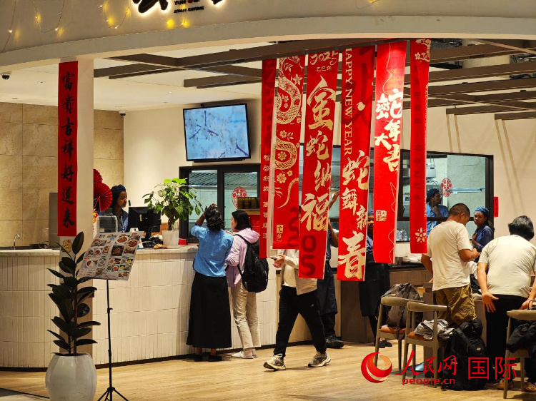 在機(jī)場的一家中餐廳,掛上了中文蛇年祝福語和春聯(lián)。人民網(wǎng)記者 黃煒鑫攝