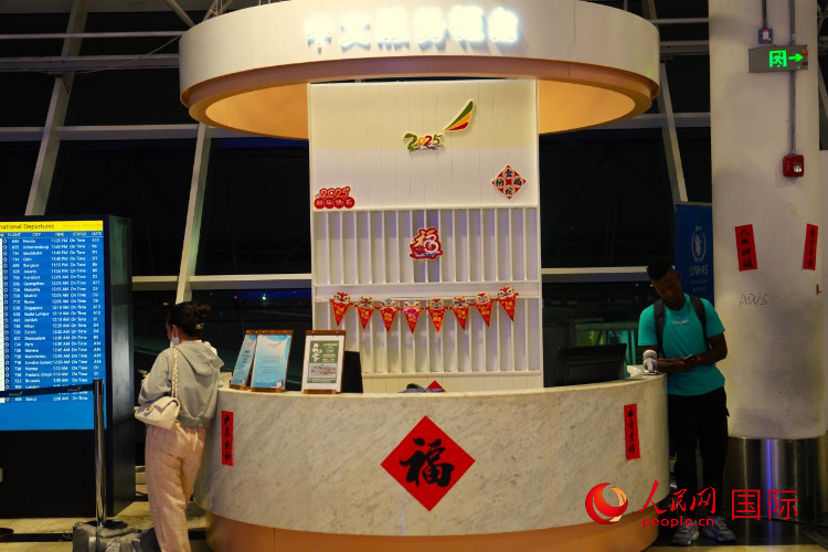 人民網(wǎng)亞的斯亞貝巴1月28日電 (記者黃煒鑫)除夕前夕,記者走進(jìn)埃塞俄比亞首都亞的斯亞貝巴博萊國際機(jī)場,感受濃濃中國年味。紅燈籠、春聯(lián)、中國結(jié)……在這座東非最繁忙的航空樞紐里,中國春節(jié)元素隨處可見。