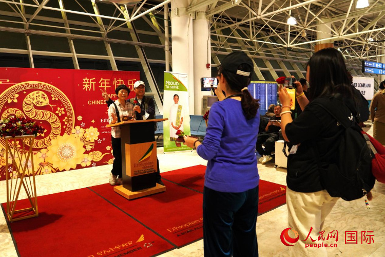 在埃塞航空春節(jié)慶?;顒蝇F(xiàn)場,即將回國的一對中國夫婦在合影留念。人民網(wǎng)記者 黃煒鑫攝