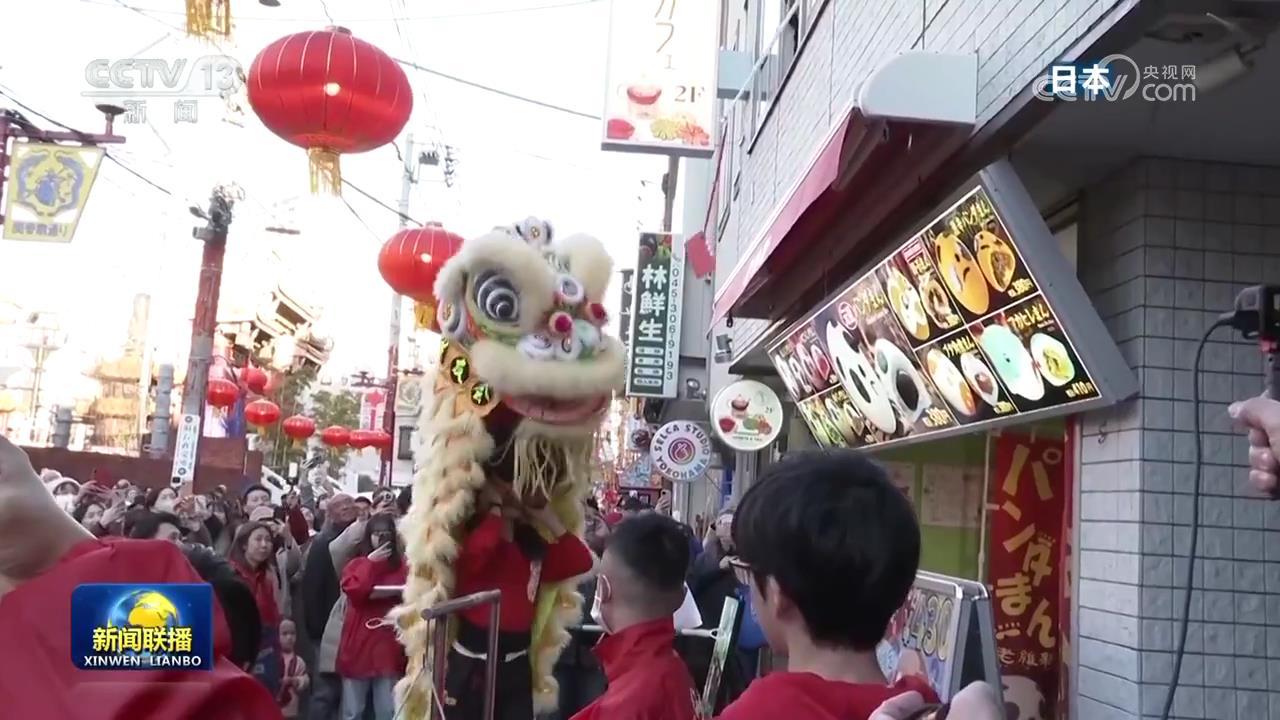 在日本橫濱的中華街,當(dāng)?shù)貞c祝春節(jié)的傳統(tǒng)儀式舞獅采青吸引了大量民眾觀看。