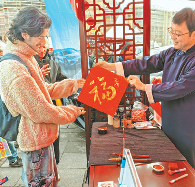活動(dòng)現(xiàn)場(chǎng)的非遺手工藝品和美食區(qū)也吸引了大量當(dāng)?shù)孛癖妳⑴c,傳統(tǒng)手工藝糖畫(huà)、毛筆書(shū)法體驗(yàn)展位前更是排起了長(zhǎng)龍。當(dāng)?shù)孛癖娨翣柕掀澟抨?duì)很久終于如愿領(lǐng)取禮品,他饒有興致地觀看現(xiàn)場(chǎng)工作人員寫(xiě)下金色的“?!弊郑€特別要求加上他姓氏的中文譯名?!斑@是我第一次逛春節(jié)廟會(huì),這里熱鬧紅火,還有美食和禮品,向所有人開(kāi)放,非常新奇,富有創(chuàng)意。如果有機(jī)會(huì),我希望親自去中國(guó)走走看看!”伊爾迪茲說(shuō)。