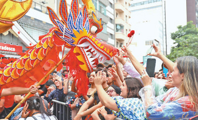 在巴西圣保羅“歡樂(lè)春節(jié)”游園會(huì)上,現(xiàn)場(chǎng)觀眾與舞龍隊(duì)互動(dòng)。人民日?qǐng)?bào)記者 時(shí)元皓攝
