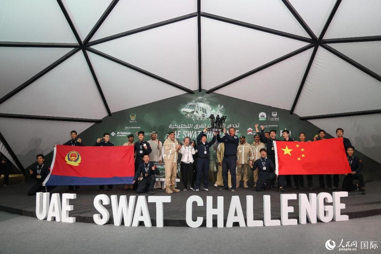 人民網(wǎng)迪拜2月6日電(記者管克江、任皓宇)2月5日晚,位于迪拜的第六屆阿聯(lián)酋特警挑戰(zhàn)賽現(xiàn)場,祥獅舞動(dòng),紅旗飄揚(yáng)。在現(xiàn)場觀眾的助威吶喊聲中,中國特警隊(duì)員緊密協(xié)作,爬繩、穿網(wǎng)、攀墻,翻越障礙賽場一個(gè)個(gè)項(xiàng)目,以優(yōu)異成績完成挑戰(zhàn)。經(jīng)過連續(xù)五日的比賽,浙江特警隊(duì)和安徽特警隊(duì)勇奪第六屆阿聯(lián)酋特警挑戰(zhàn)賽冠軍和季軍。公安部派出的特警隊(duì)也獲得優(yōu)秀成績。