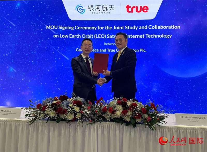 銀河航天創(chuàng)始人、董事長兼CEO徐鳴(左)與True Corporation首席執(zhí)行官Manat Manavutiveth簽署合作備忘錄。人民網(wǎng)記者 簡承淵攝