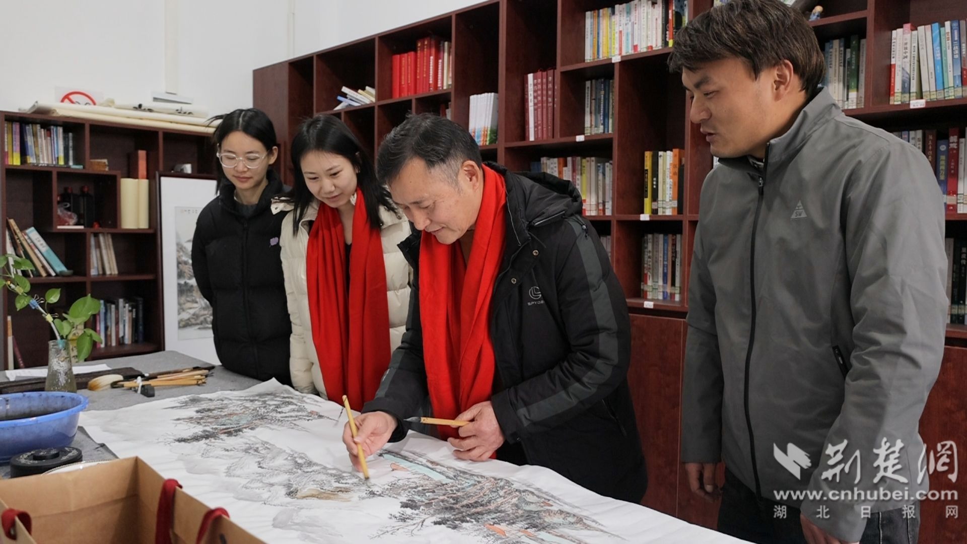 彭建勛與同事講解作畫(huà)技巧。通訊員 供圖