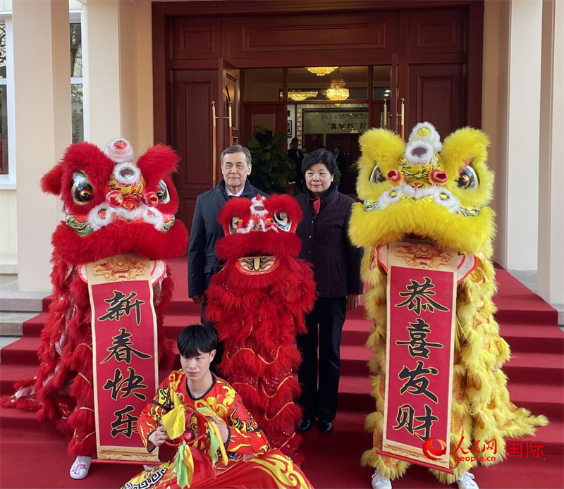 上海合作組織秘書長葉爾梅克巴耶夫(左)與上海合作組織睦鄰友好合作委員會(huì)副主席崔麗同舞獅合影。人民網(wǎng)記者 陳熙芮攝
