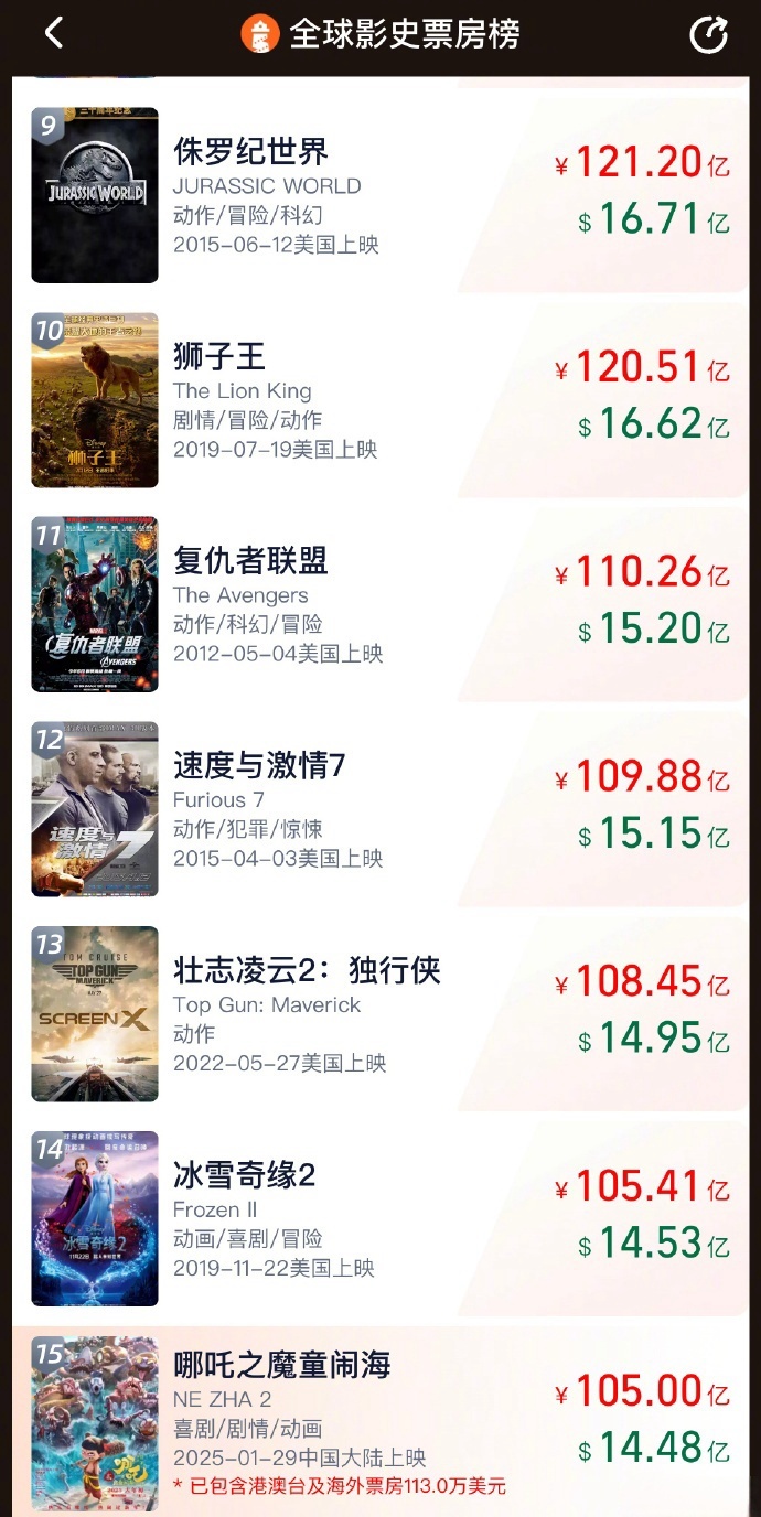 央視網(wǎng)消息:據(jù)統(tǒng)計,《哪吒之魔童鬧?!房偲狈浚êc映及預(yù)售)已超過《芭比》,成功進入全球影史票房TOP15。