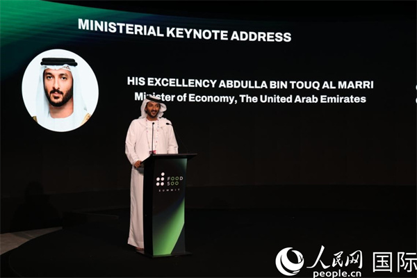 阿聯(lián)酋經(jīng)濟(jì)部部長瑪爾伊在“食品500強(qiáng)”工商論壇上致辭。人民網(wǎng)記者 張志文攝