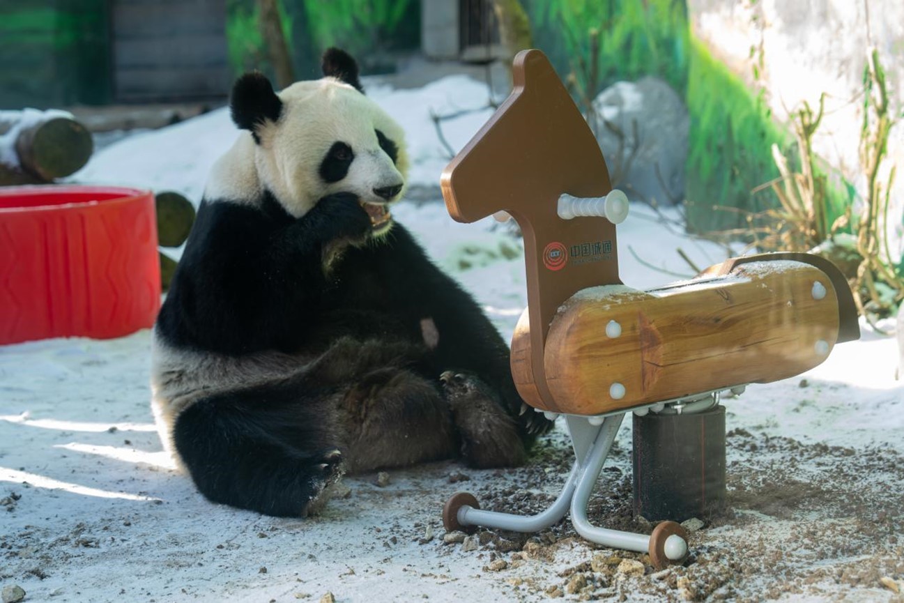 大熊貓“喀秋莎”在木馬旁玩耍。中誠通國(guó)際投資有限公司供圖