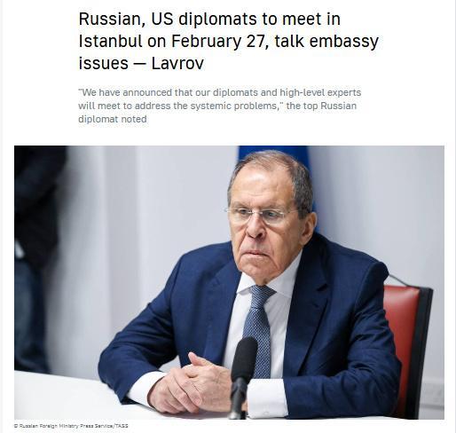 中新網(wǎng)2月27日電 據(jù)塔斯社、路透社報(bào)道,當(dāng)?shù)貢r(shí)間2月26日,俄羅斯外長(zhǎng)拉夫羅夫表示,俄羅斯和美國(guó)代表將于2月27日在土耳其伊斯坦布爾舉行會(huì)談,討論兩國(guó)大使館運(yùn)作相關(guān)問題。