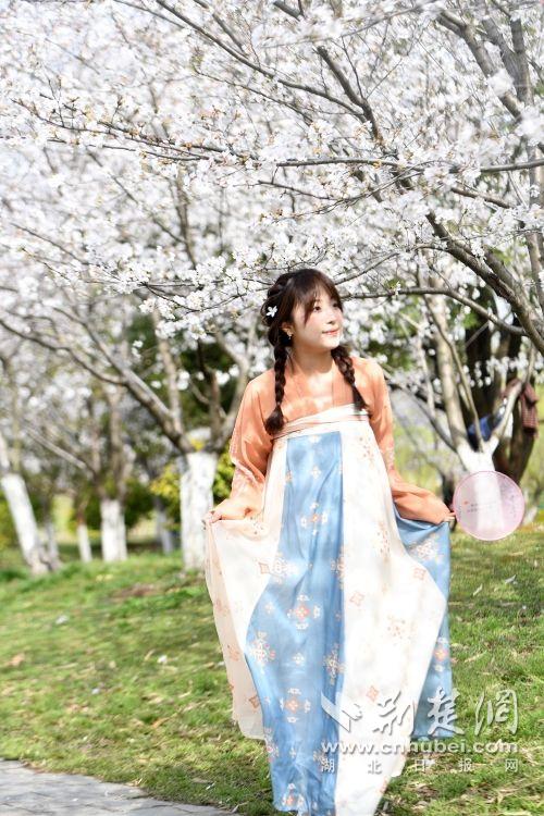 堤角公園園內(nèi)不少身著漢服、帶齊拍攝裝備的博主前來(lái)打卡拍照,將賞花美圖發(fā)布在社交平臺(tái)上,帶火“賞櫻”熱度。通訊員供圖