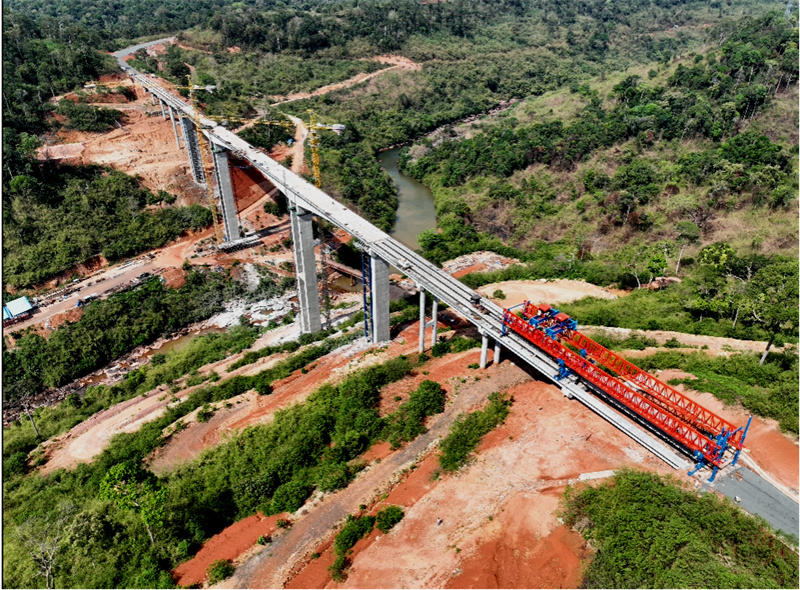 28號(hào)大橋全長(zhǎng)530米,高80米,橫跨額勒賽河山谷,建成后將成為柬埔寨最高墩橋梁和首座跨山脊高架橋。大橋毗鄰國(guó)家級(jí)自然保護(hù)區(qū)和一級(jí)水源保護(hù)地,施工難度大,安全風(fēng)險(xiǎn)高。項(xiàng)目團(tuán)隊(duì)克服了深基坑開(kāi)挖、臨河施工等難題,研發(fā)了掛籃自動(dòng)行走、無(wú)線測(cè)溫監(jiān)控等10余項(xiàng)新技術(shù),提升了施工安全性和工程質(zhì)量。