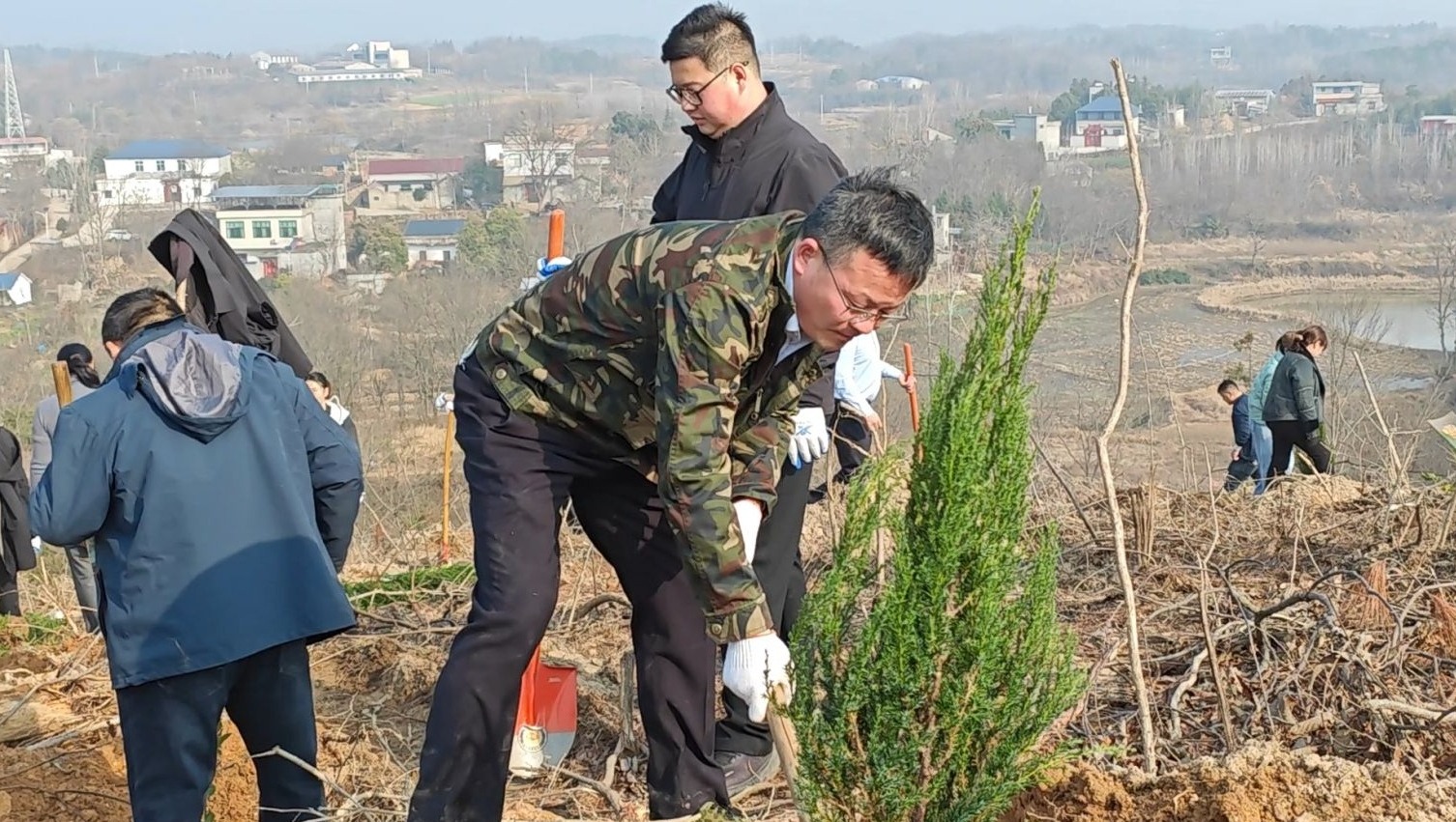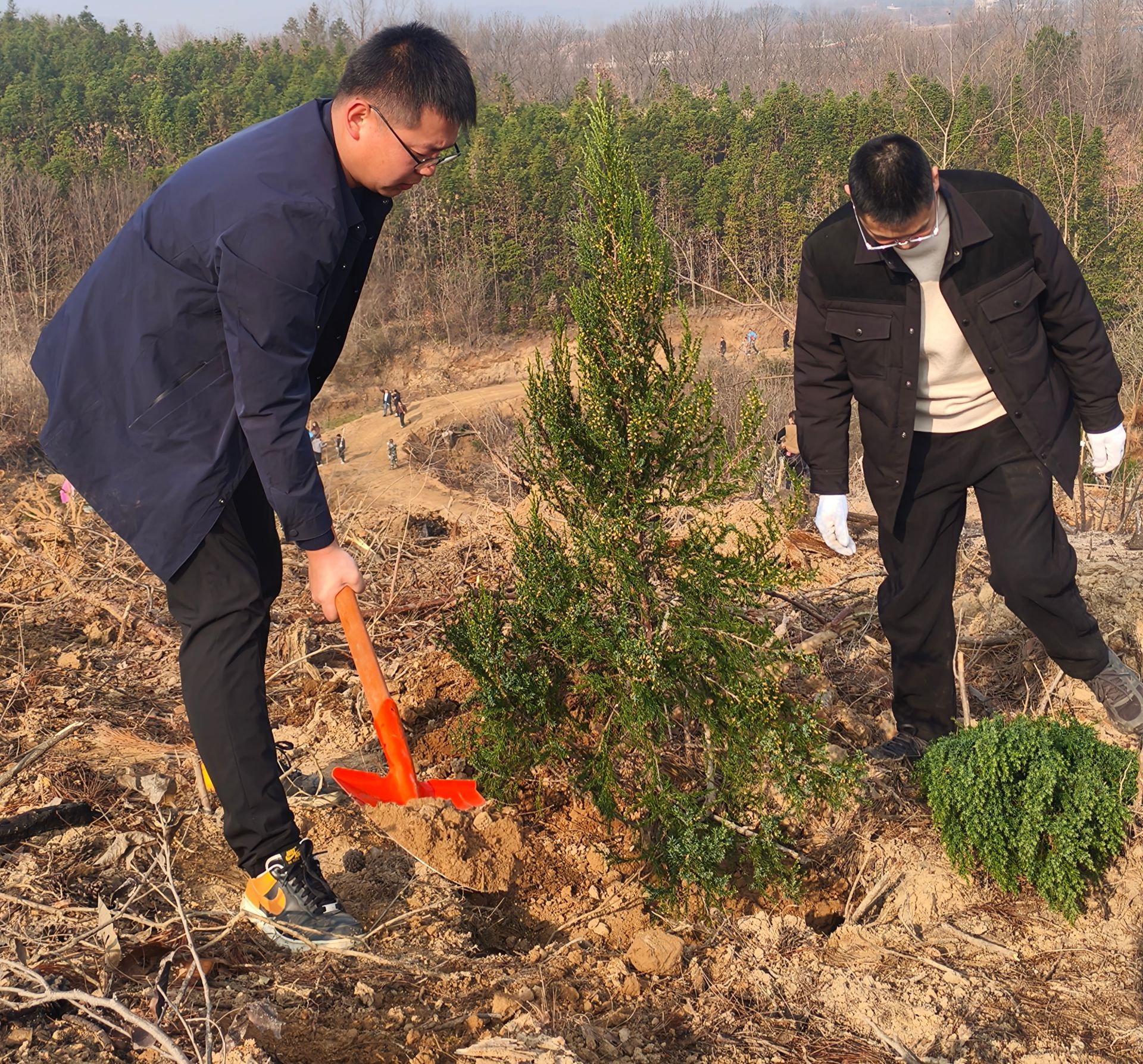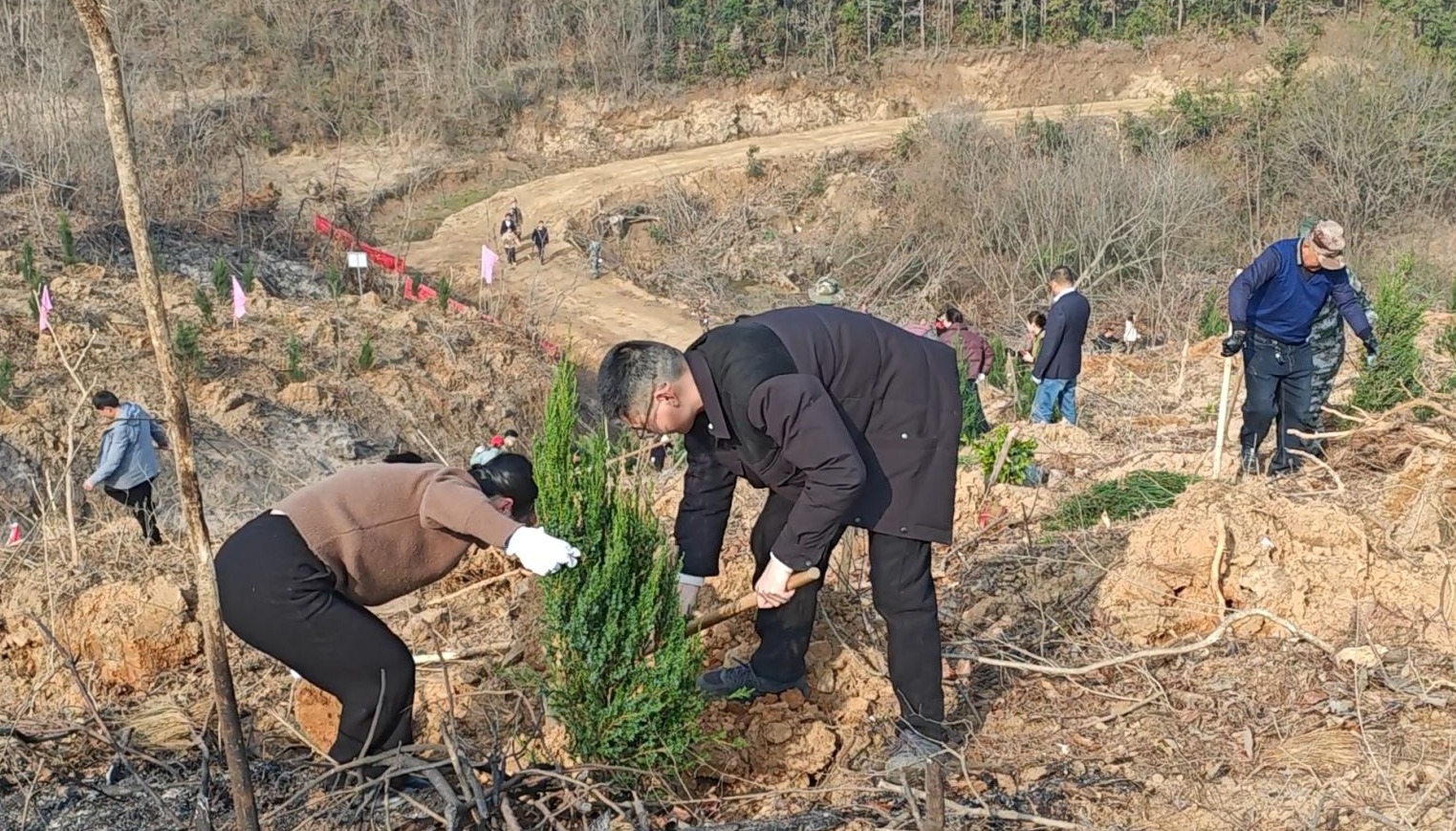 春風(fēng)輕拂綠意濃,植樹造林正當(dāng)時。參與人員熱情十分高漲,分工明確,配合默契。迎著和煦春風(fēng),在技術(shù)人員的指導(dǎo)下,黨員干部、志愿者們揮鍬挖坑、鏟土培土、扶苗壓實,澆水灌溉,經(jīng)過近兩個小時的辛勤勞動,新栽種的100余畝的刺柏和油茶樹苗迎風(fēng)挺立,形成了一道靚麗的風(fēng)景線,助力提升宣化店鎮(zhèn)含“綠”量。