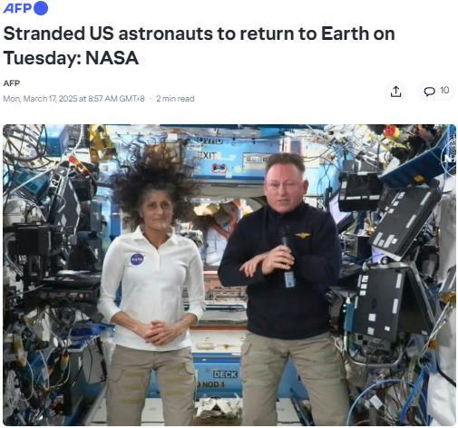 中新網(wǎng)3月17日電 據(jù)法新社報(bào)道,當(dāng)?shù)貢r(shí)間16日,美國國家航空航天局(NASA)發(fā)表聲明稱,滯留在國際空間站九個(gè)多月的美國宇航員,預(yù)計(jì)提前于當(dāng)?shù)貢r(shí)間3月18日晚上返回地球。