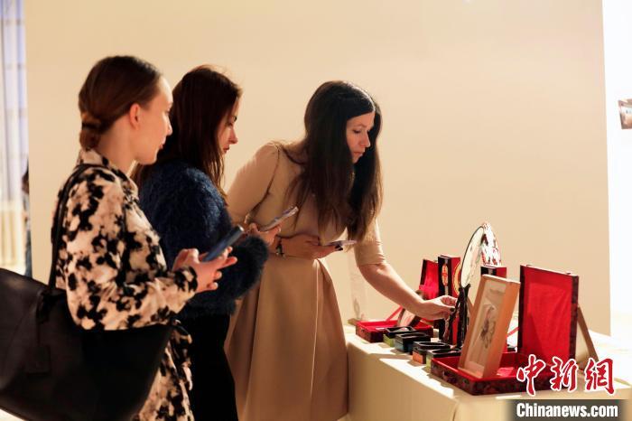 當(dāng)?shù)貢r(shí)間3月19日,“三湘四水 相約湖南”走進(jìn)俄羅斯文旅推廣活動(dòng)在莫斯科中國文化中心舉行。圖為俄羅斯觀眾參觀湘繡、湘茶、湘瓷等“湘字號(hào)”展覽。(中新網(wǎng)記者 田冰 攝)