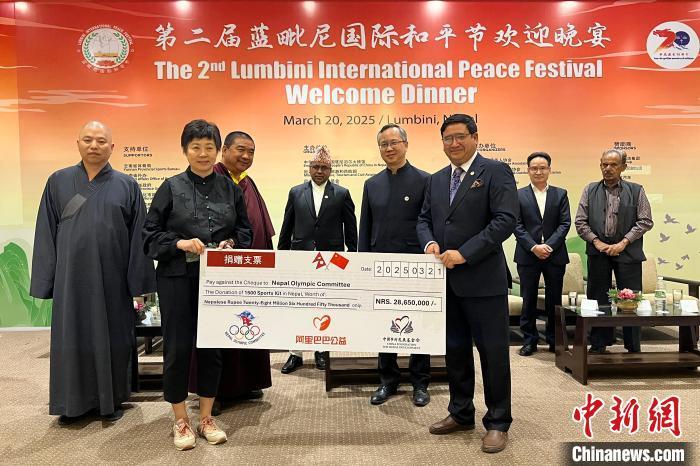 當地時間3月20日晚,第二屆藍毗尼國際和平節(jié)歡迎晚宴在尼泊爾藍毗尼舉行,尼泊爾國際愛心包裹“體育包”項目在晚宴上啟動。尼泊爾文化、旅游與民航部長潘迪(左四)、中國駐尼泊爾大使陳松(左五)等嘉賓見證捐贈。中新社記者 崔楠 攝