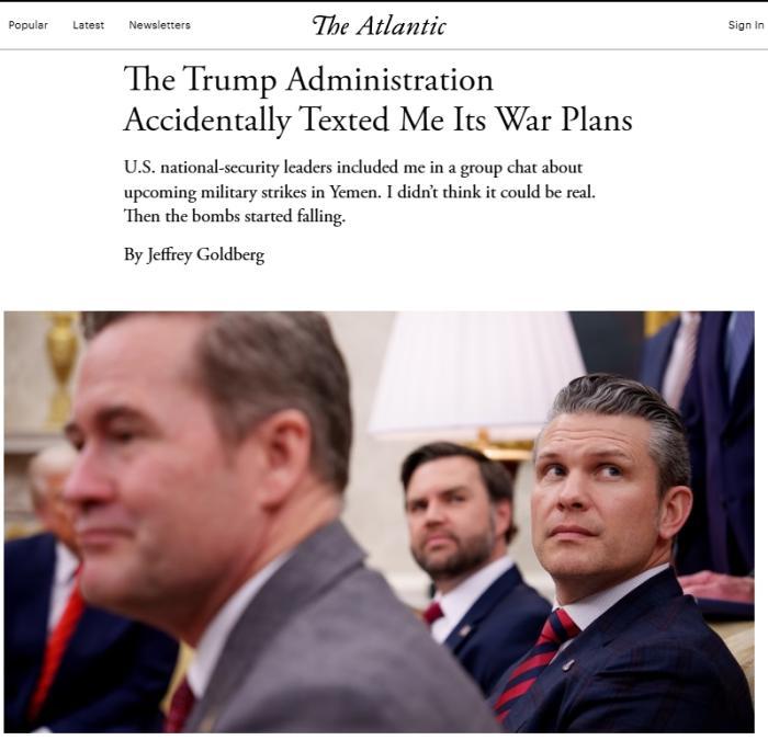當(dāng)?shù)貢r(shí)間3月24日,《大西洋月刊》主編杰弗里·戈德伯格在一篇報(bào)道中說,3月13日,美政府高層官員無意中將他拉進(jìn)商討打擊也門胡塞武裝的群聊當(dāng)中。