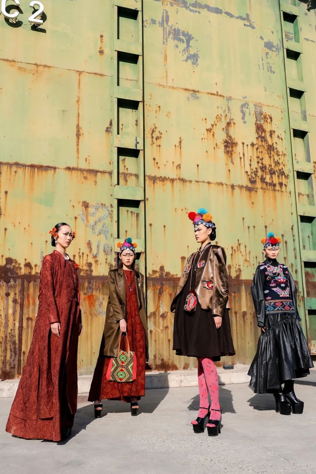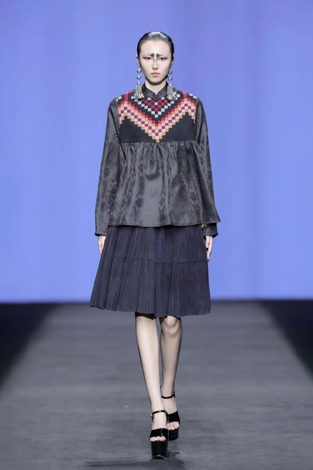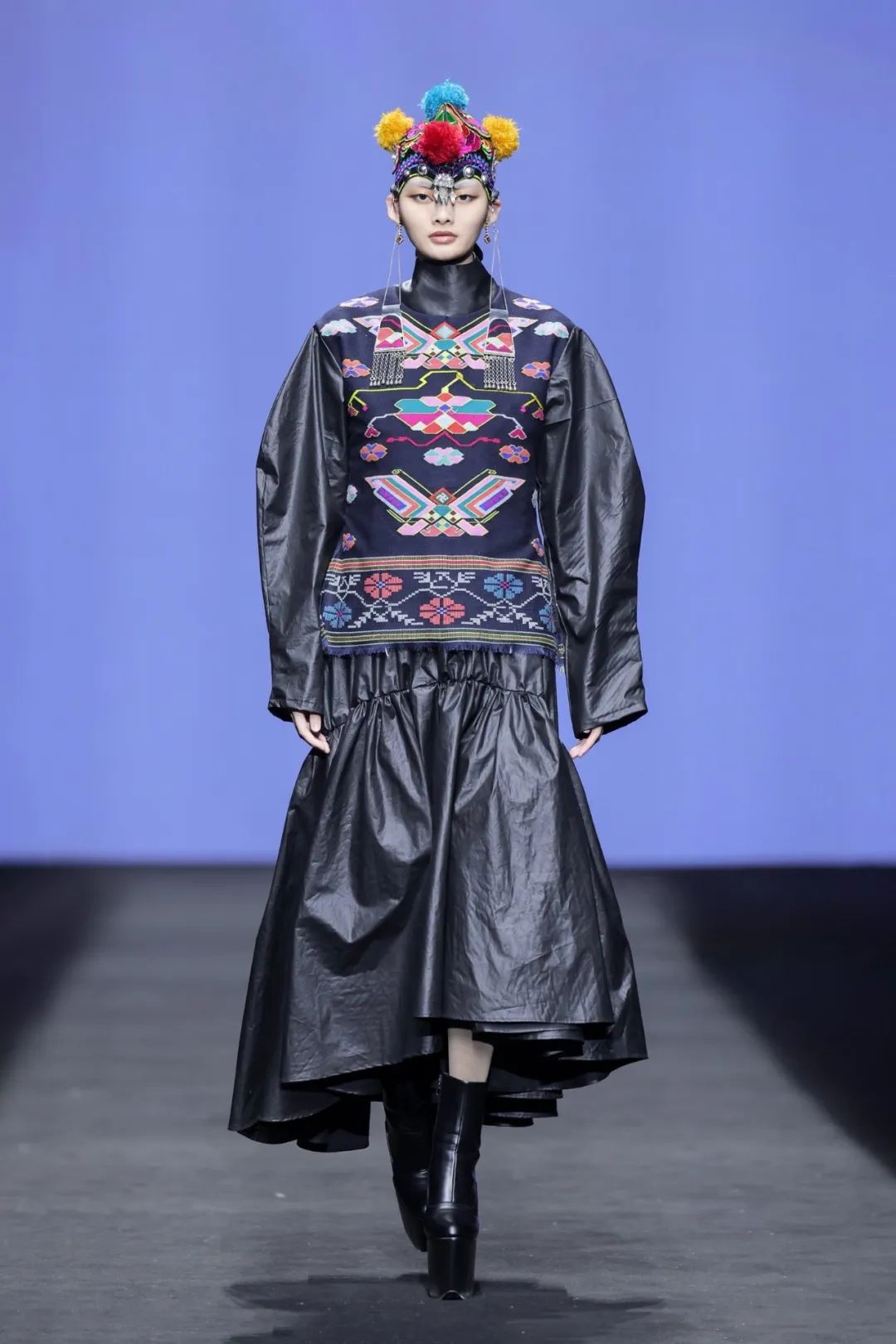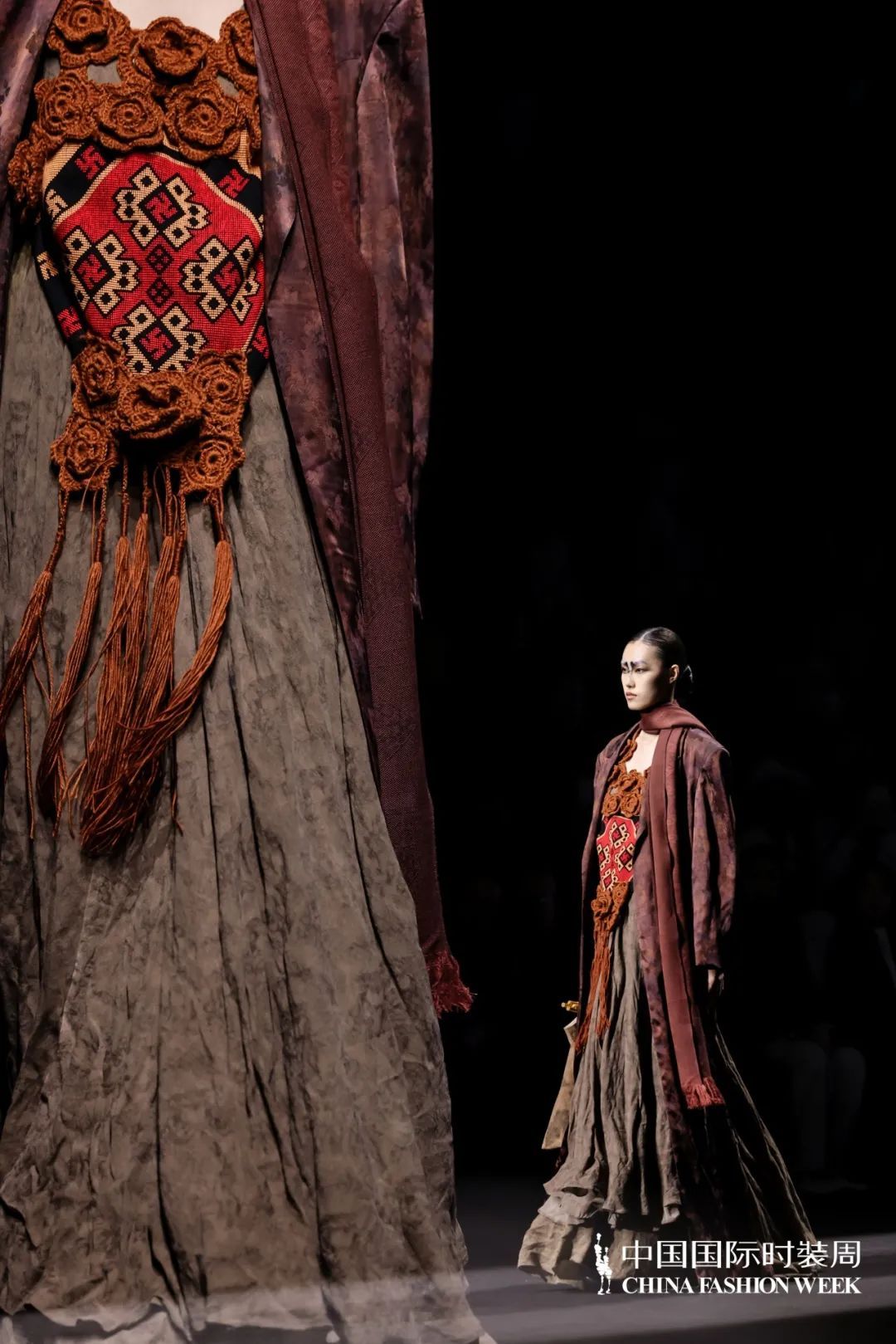 在本次時(shí)裝周上,周瓊選取西蘭卡普中的經(jīng)典圖案,如雙陽雀、鳳穿牡丹、四十八勾等,并通過現(xiàn)代剪裁手法和大膽的色彩碰撞,賦予了古老織錦全新的生命力。