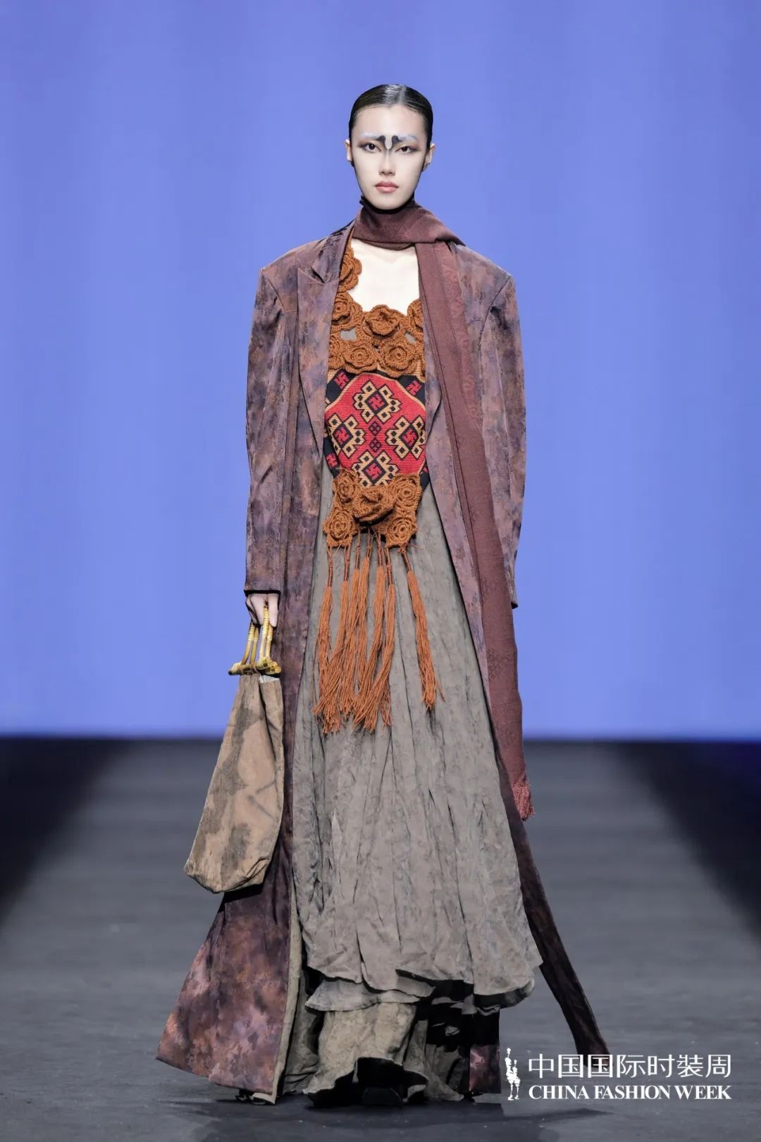 本次時(shí)裝周共展示了四大系列作品。其中,以西蘭卡普為核心元素的系列,憑借炫麗的色彩、精美的圖案和精湛的工藝,瞬間抓住眾人目光,為這場(chǎng)大秀注入了深厚文化內(nèi)涵,毫無懸念地成為全場(chǎng)焦點(diǎn)。這一系列作品的廓形設(shè)計(jì)流暢自然,與西蘭卡普的傳統(tǒng)圖案相互映襯、相得益彰,碰撞出奇妙火花,打造出一系列服裝臻品。它們既散發(fā)著濃郁的傳統(tǒng)韻味,又巧妙融入現(xiàn)代時(shí)尚美學(xué),在保留手工織錦原始質(zhì)感的同時(shí),充分考量當(dāng)代人的審美理念,真正實(shí)現(xiàn)了傳統(tǒng)與現(xiàn)代的無縫對(duì)接與完美融合。