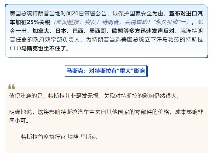 美國(guó)特斯拉公司首席執(zhí)行官埃隆·馬斯克26日在社交媒體平臺(tái)上表示,美國(guó)總統(tǒng)特朗普的汽車關(guān)稅政策將對(duì)特斯拉產(chǎn)生“重大”影響。馬斯克稱,這將影響來(lái)自其他國(guó)家的特斯拉汽車零部件的價(jià)格。